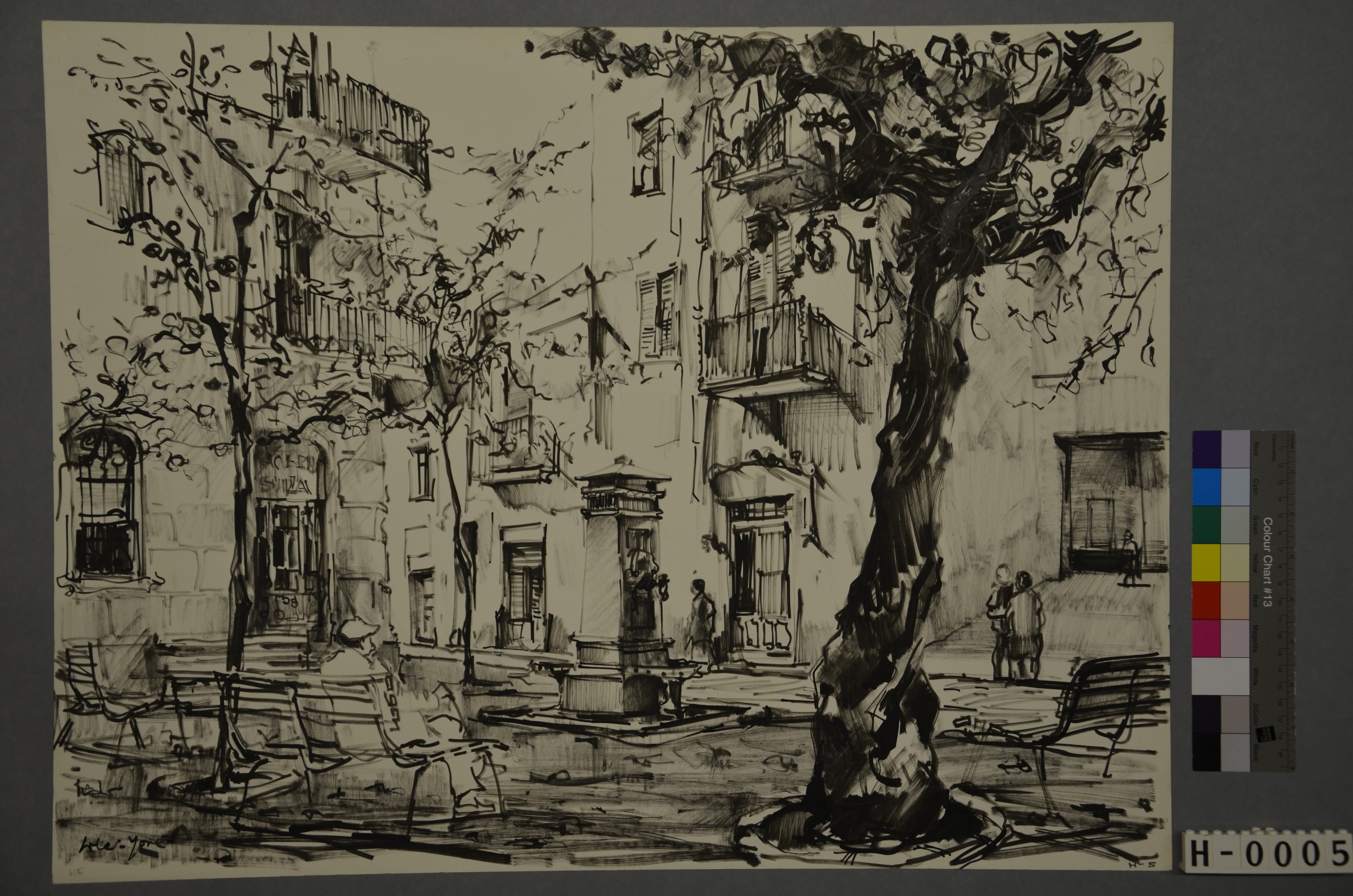 Descripció:Dibuix realitzat amb colors negres i grisos. Elements més destacats: una font de ferro centra el dibuix. Hi ha tres arbres, dos d'ells prims i el més situat a la dreta gruixut. Tres bancs de jardí en un dels quals hi ha assegut un home que porta una gorra. Al fons casses amb balcons i tres figures.