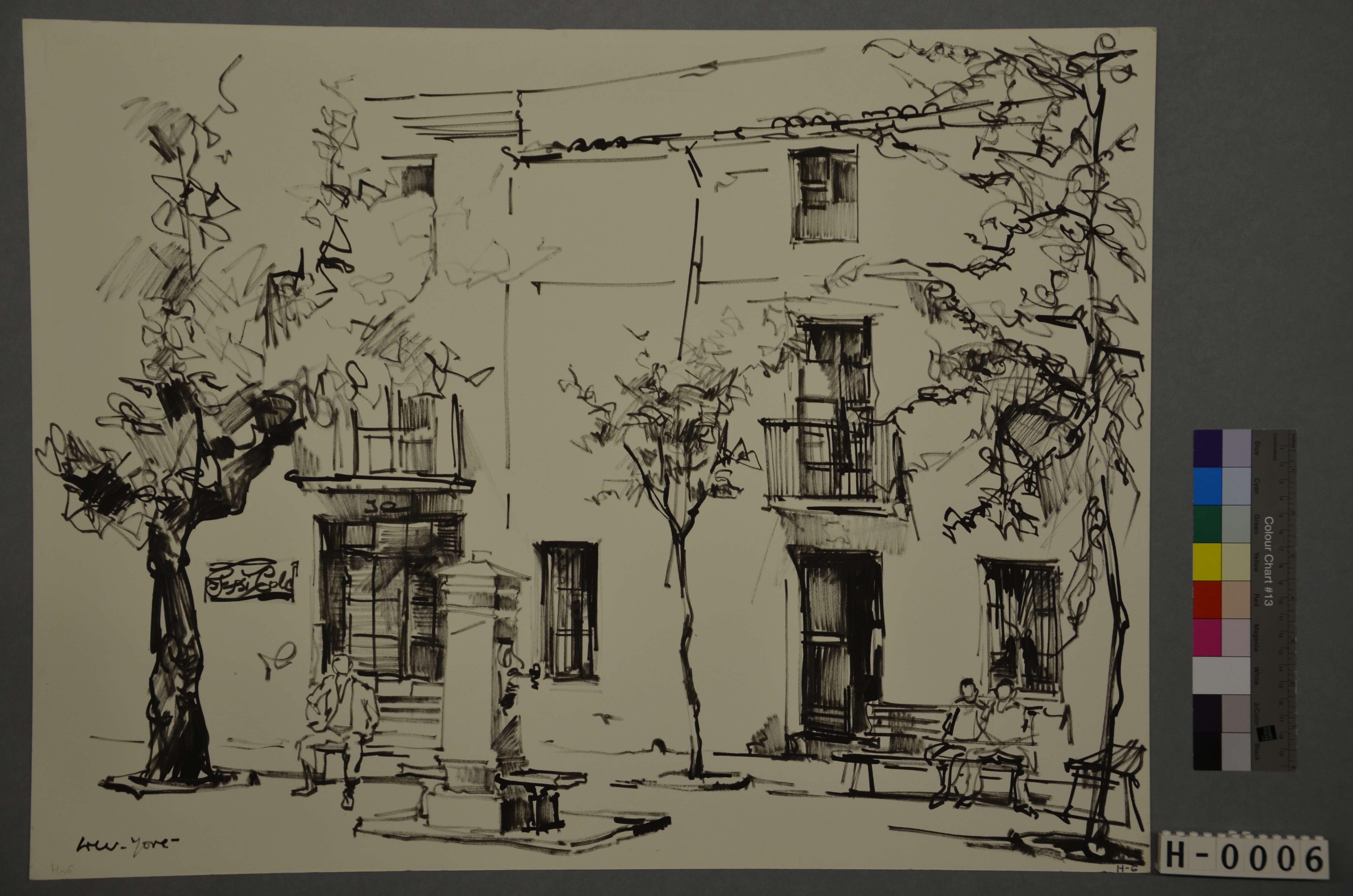 Descripció:Dibuix realitzat amb colors negres i grisos. A l'esquerra un arbre gros. A tocar de l'arbre un anunci de la Pepsi-Cola. Al centre una de ferro i un arbret. A la dreta un arbre prim i llarg. Al fons una lína de cases amb dos balcons, un banc amb un home i un altre amb una parella.