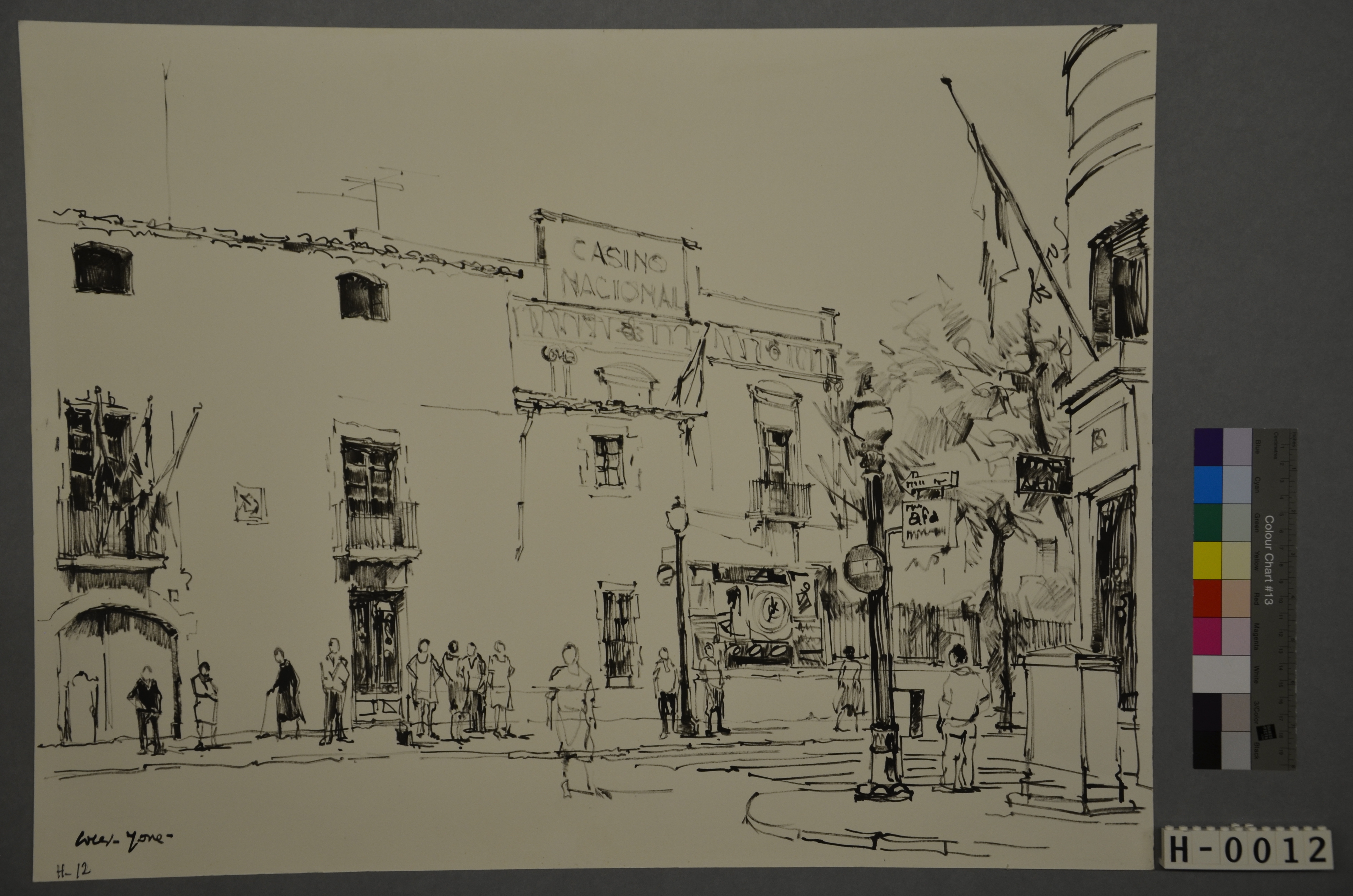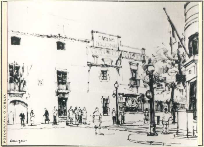 Descripció:Dibuix realitzat amb colors negres i grisos. A l'esquerra una edificació que té una portalada en forma d'arc, un balcó a sobre i una finestreta arran de teulada. Continua l'edificació cap a la dreta i al capdamunt s'hi veu un rètol amb l'inscripció casino nacional. A primer terme, a la dreta, un edifici que fa cantonada amb un pal de bandera i un fanal a la vorera.